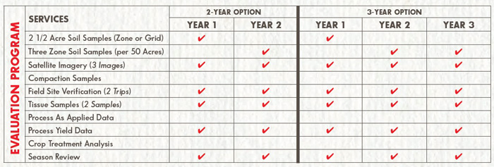 The Evaluation program is a longer-term, more refined approach that establishes a baseline for crop management programs and systematically monitors and evaluates crop progress throughout the growing season. The two-to-three year package starts with two-and-a-half acre soil samples in year one and adds in-season satellite imagery to the Discovery program services.