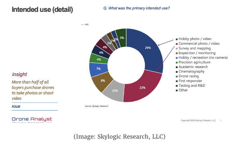 The chart below is from the April 2016 Drones in the Channel: 2016 Market Report developed by Skylogic Research. I like this report because they have not only researched different industries, but also channels of distribution, purchasing trends, price points and popular brands.