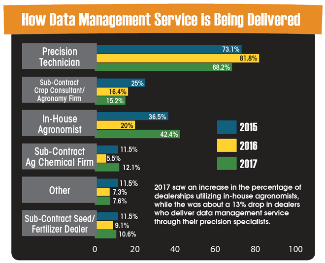 Also increasing in popularity is partnering with local ag chemical firms for data management services, with 12.1% of dealers choosing this method in 2017, compared to 5.5% last year.