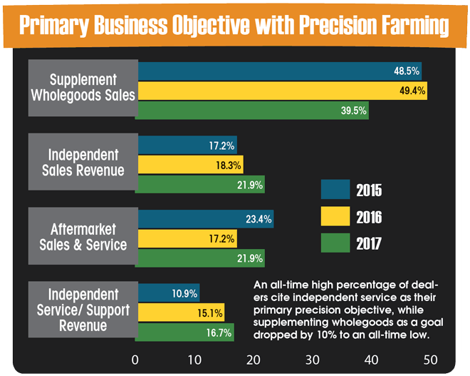 Some 21.9% of dealers said their primary goal with their precision business is independent sales of hardware and products, up about 3 points over 2016 and 4 points over 2015. However, this is still well below the high of 28.6% in 2014.