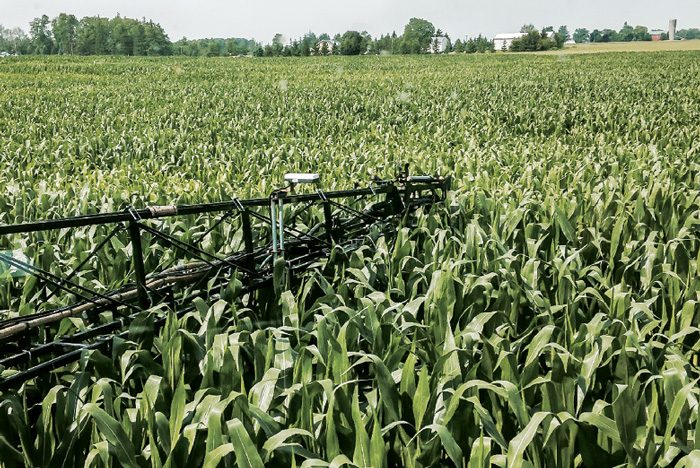 KNOWING THE RANGE. Exeter, Ontario, strip-tiller Mike Stran uses Ag Leader’s OptRx crop sensors installed on his high-clearance sprayer — with a Y-Drop system installed in 2013 — to apply late nitrogen on his corn.