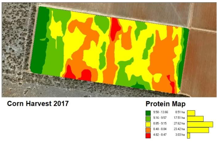 As such for every bushel or ton of corn harvested, there is approximately .7lb or 12.8kg (based on a protein level of 8%). By measuring the protein content and the yield, then a Nitrogen Removal Map can be generated. This map can then be used to develop Variable Rate Nitrogen Fertilization prescriptions. The net results can be an optimization of the yield across the field and a reduction in fertilizer usage.