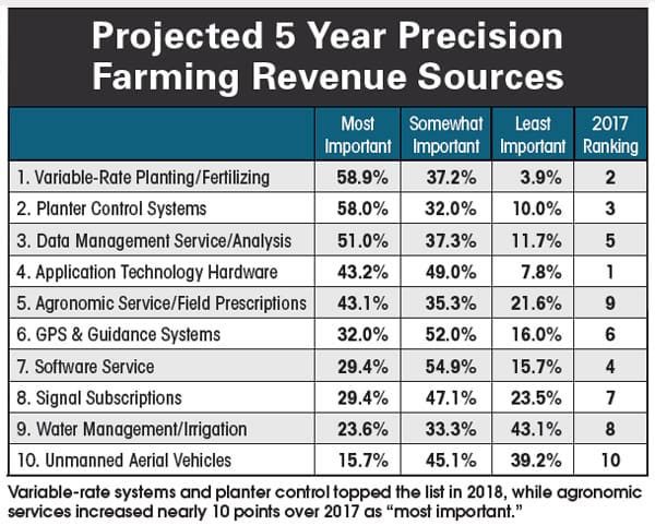 Ranking second is planter control systems, which includes down force, row clutches electric drives and seed meters, with 58% of dealers ranking this category as “most important” during the next 5 years. Planting and seeding controls have historically been viewed as a precision revenue priority with 60% of dealers seeing it as “most important” in both 2017 and 2016.