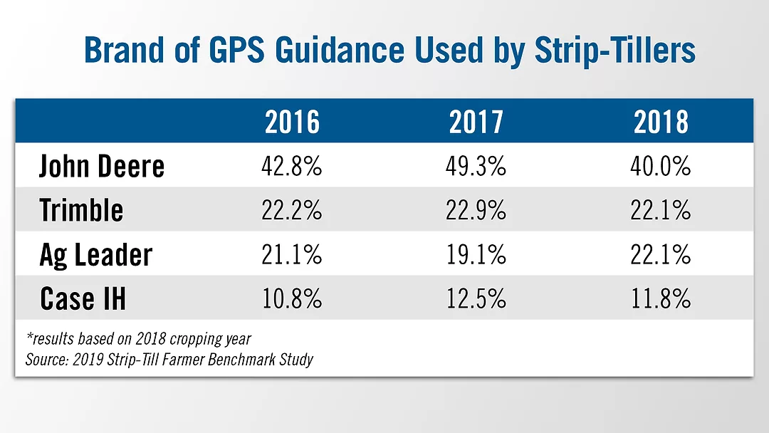 Trimble and Ag Leader tied for the second spot at about 22% each, largely consistent with prior years, while just under 12% of strip-tillers utilize Case IH GPS systems.