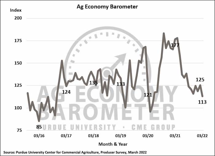 When compared to a year earlier, producers’ appraisal of current conditions was down 44% while their expectations for the future fell 31%. The Purdue University-CME Group Ag Economy Barometer sentiment index is calculated each month from 400 U.S. agricultural producers’ responses to a telephone survey. This month’s survey was conducted from March 14-18, 2022.