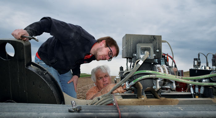 Wrench in hand, Pete Kopriva attempts to pinpoint the source of an oil leak on the alternator of a customer’s Case IH 36-row Early Riser 1265 planter.
