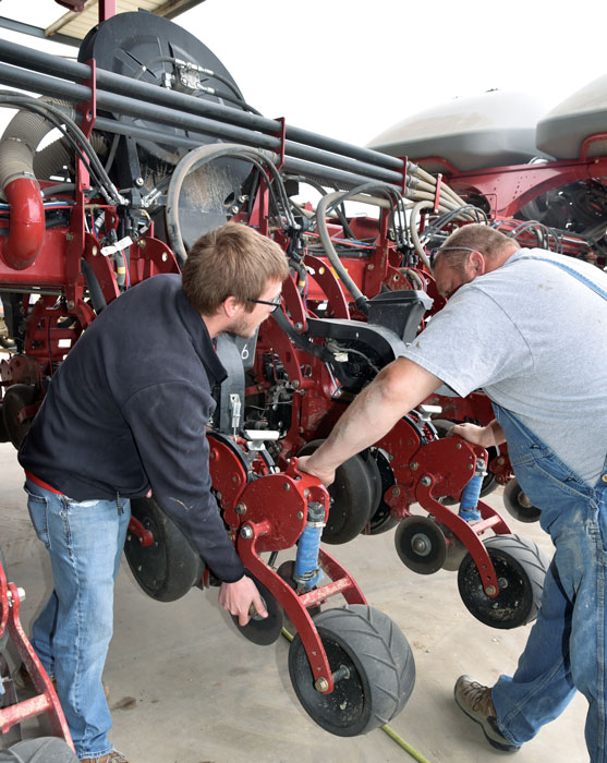 Pete Kopriva and Ryan, a customer who farms nearly 5,000 acres in the West Liberty, Iowa, area, take a closer look at row unit 6, which had a downforce issue caused by a broken wire.