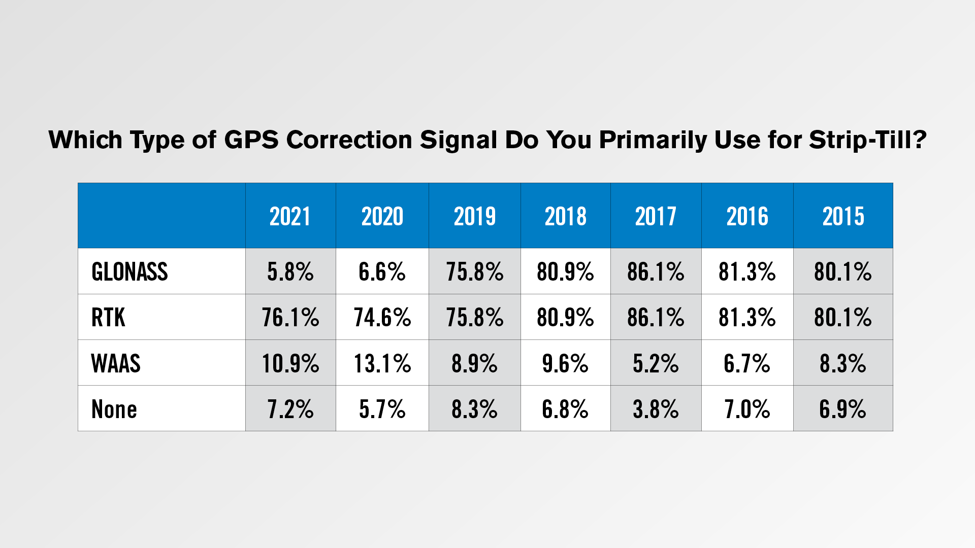 Most surveyed strip-tillers are using RTK guidance for strip-till. About 76% of respondents indicated RTK is their primary type of GPS correction signal, a slight increase from the 74.6% reporting using RTK in 2021.