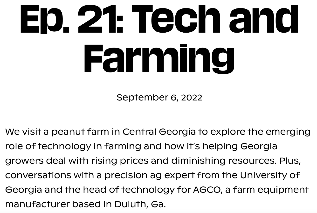 The WABE Tech Cast packs a lot of content into this 13-minute podcast from the Peach State. The hosts visit a peanut farm in central Georgia to explore the role of technology in farming and how it’s helping local growers deal with rising costs and fewer resources. A precision ag expert from UGA and AGCO’s head of technology also join the conversation.