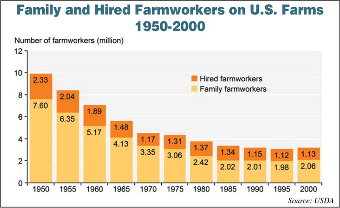 - The farm workforce decreased 70% over 50 years (1950–2000), and the trend has continued since 2000. Family farms selling to larger operators for multiple reasons with death, divorce and cost structure among the top 3.