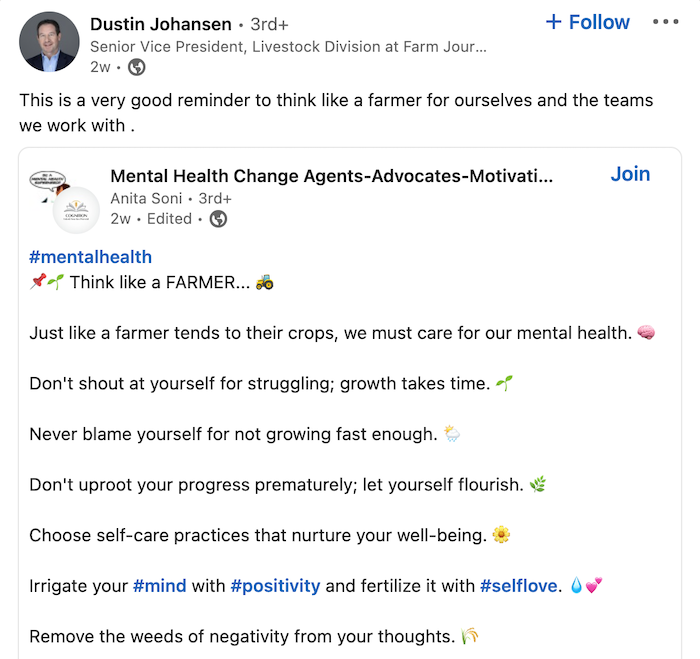 If we all thought like farmers, how much better would we all be? Dustin Johansen shares this LinkedIn post from Anita Soni.