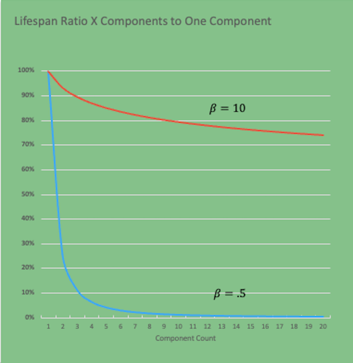 Figure 3. This “bathtub” shaped graph plots the expectation of machine failures based on the Weibull failure rate, which is used in reliable engineering to map failures. The X axis illustrates the number of components, and the Y axis is the failure rate. The blue line represents low beta probability — random initial failures, such as a bad plug or electronics that don’t immediately work. The red line is high beta failures, such as a component that wears out over time. Mitchell says he’s concerned that most of his machine failures are low beta issues, which make the entire system unreliable. Source: Clay Mitchell