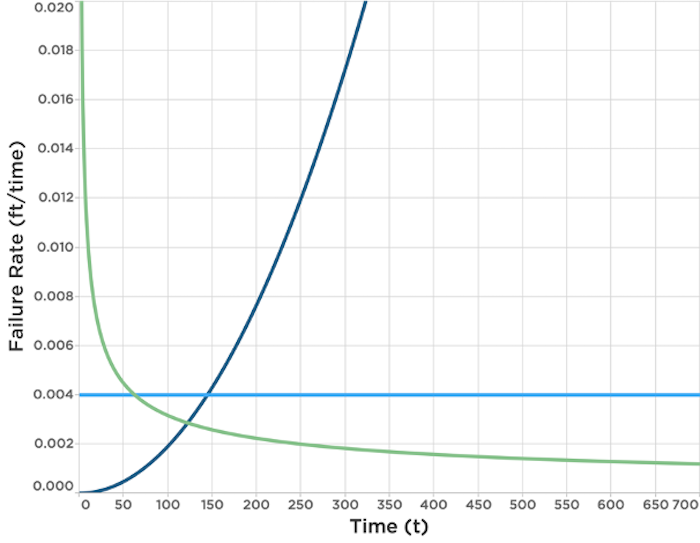 Figure 2. This chart illustrates the Weibull failure rate, which can be used to map a machine’s reliability failures. The green line shows low beta probability distribution that illustrates high initial failure rates, such as the electronics on a brand new combine that didn’t work initially but work as soon as a bad plug is fixed. The dark blue line, referred to as high beta, are the components that wear out, such as cultivator shanks. The light blue line represents random failures. Source: Clay Mitchell