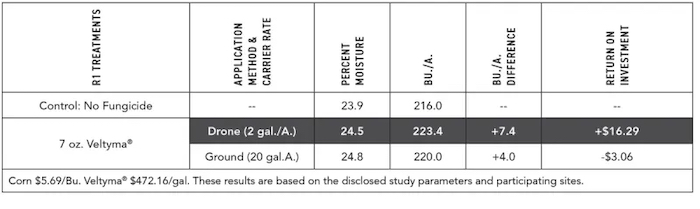"None of the testing locations experienced much, if any, disease pressure during the growing season. The fungicide applications were all made in the morning when there was a dew on the leaves, which likely helped compensate for the lower carrier rate of the drone application. The increased concentration of the fungicide from the drone may also play a role in these results. This was a first-year study, and additional years of research and data are needed before making recommendations."