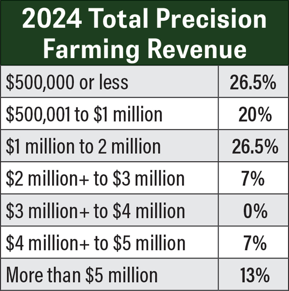 Looking ahead to 2025, 60% of dealers surveyed forecast at least a 2-7% increase in revenue from precision farming sales, while 26% expect little or no change. About 7% forecast revenue to decline 2-7% while another 7% forecast a drop of 8% or more.