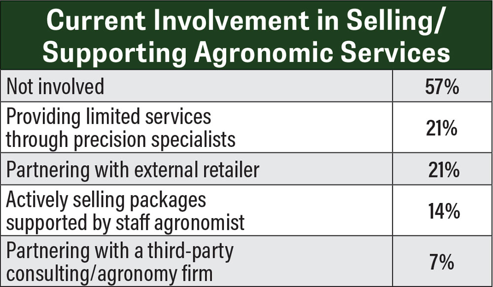 Over half of dealers surveyed are not currently selling or supporting agronomic services, while almost a quarter are either providing limited services through their own precision specialists or partnering with external retailers. Source: Precision Farming Dealer Benchmark Study