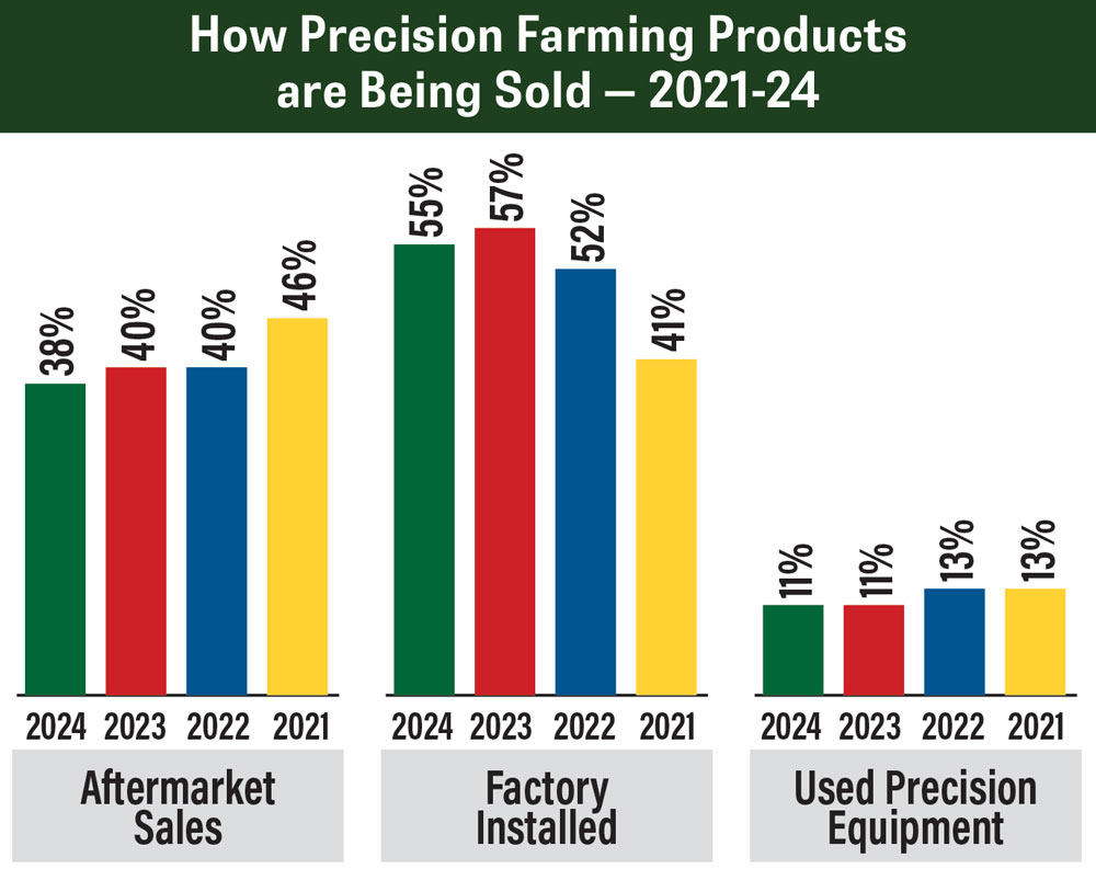 Factory installed precision systems continue to get the biggest chunk of sales for precision dealers. Aftermarket sales dropped 2 percentage points from 2023. Source: Precision Farming Dealer Benchmark Study