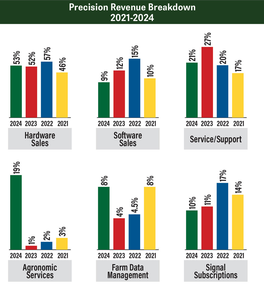 Hardware sales once again represented most of the total precision revenue in 2024 at 53%, compared to 52% in 2023 and 57% in 2022. Service/support made up an average of just over 21% of dealers’ total precision revenue, down almost 6 percentage points from 2023. Agronomic services took a giant leap in this year’s survey with nearly 19% compared to around 1% last year.