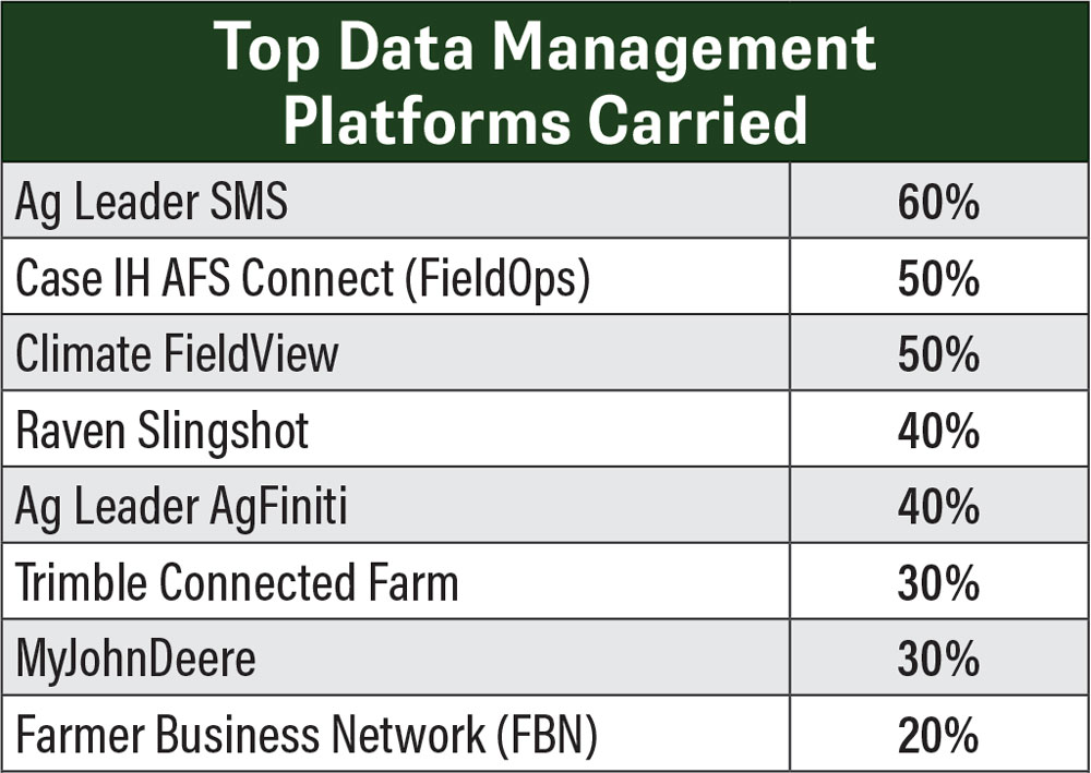 71% of dealers surveyed offered data management services in 2024, compared to just 60% in 2023. Ag Leader SMS, Case IH FieldOps and Climate FieldView were the top 3 farm data management platforms carried among dealers surveyed. Source: Precision Farming Dealer Benchmark Study