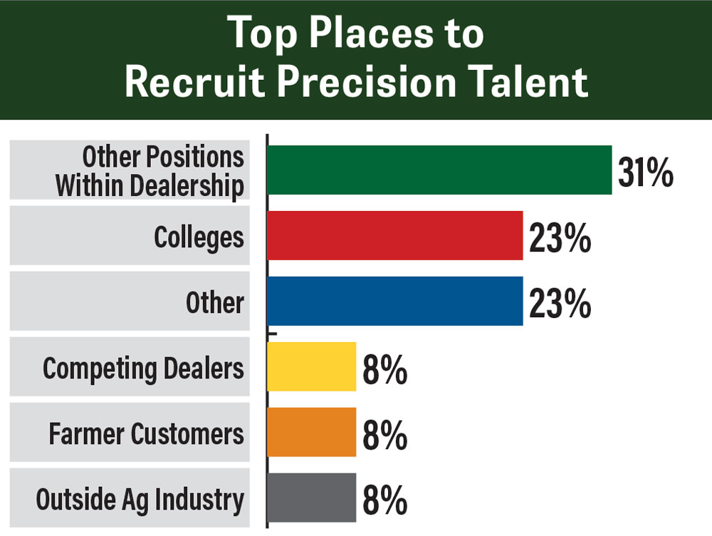 Dealers were asked, “Where do you find the most success recruiting precision employees?” 31% recruit from within, while 23% had success with college students. 23% also said “other,” which included recommendations from employees, former co-op workers and “headhunters.” Source: Precision Farming Dealer Benchmark Study