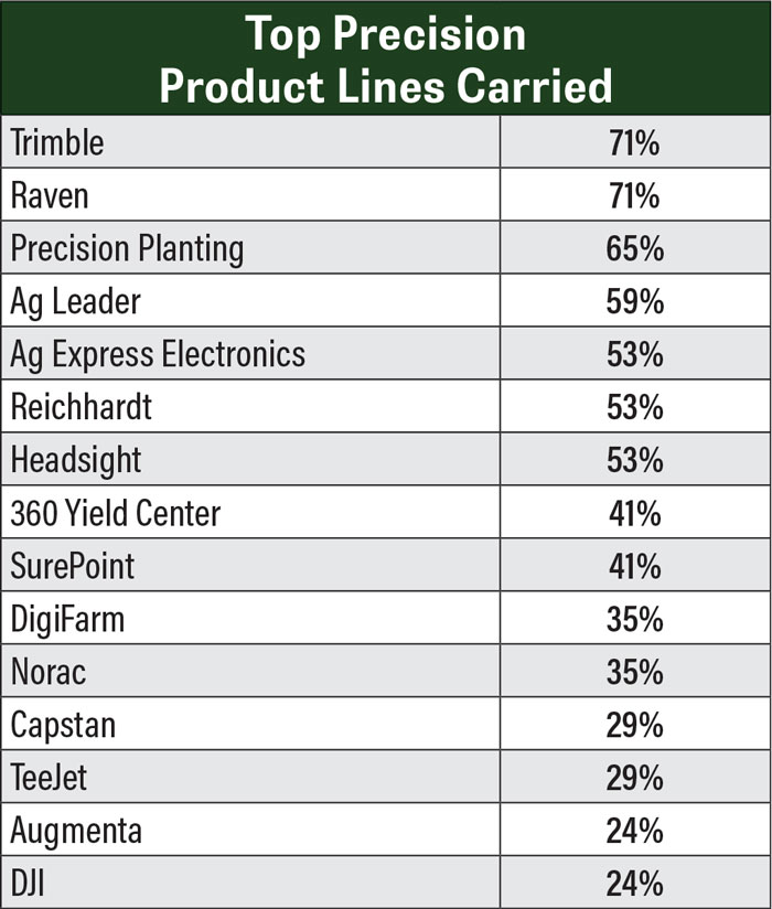 Trimble and Raven topped the list of most popular brands carried by precision dealers in 2024, followed by Precision Planting and Ag Leader rounding out the top 4. Source: Precision Farming Dealer Benchmark Study