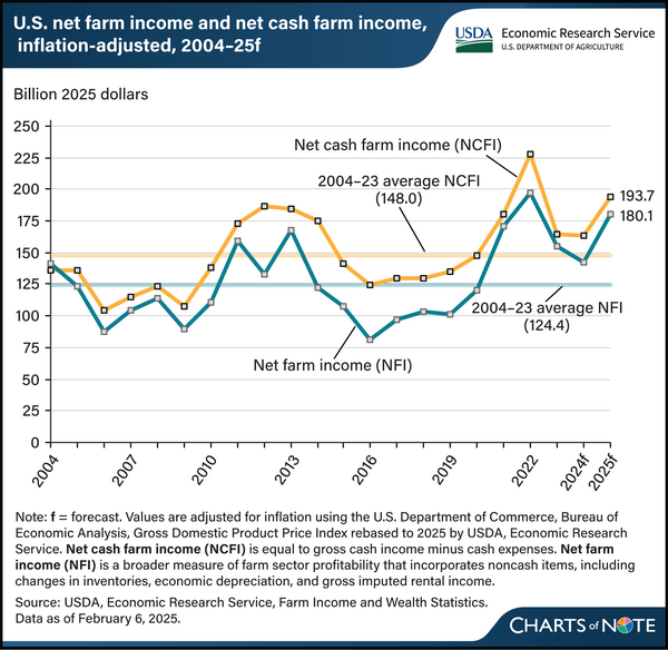 USDA's Economic Research Service forecasts inflation-adjusted U.S. net cash farm income (NCFI), defined as gross cash income minus cash expenses, to increase by $30.6 billion (18.8%) from 2024 to $193.7 billion in 2025. This comes after NCFI remained relatively stable in 2024.