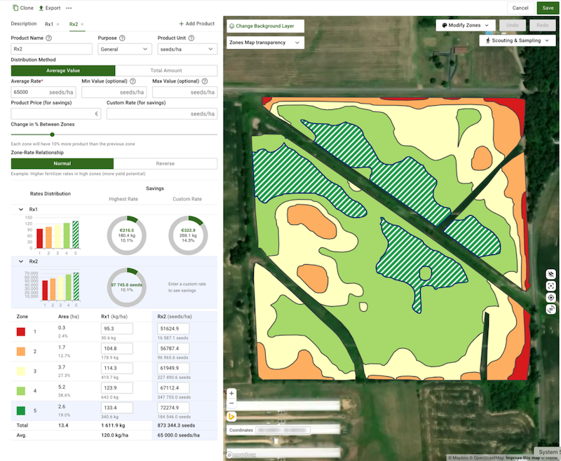 Rates Calculator replaces spreadsheet formulas with a guided interface: define average rates or total volumes, visualize cost differentials by zone in real time, adjust percentage changes instantly, and enforce planter/spreader min-max thresholds for up to three products (seed, fertilizer, crop protection).