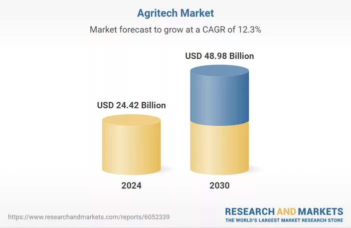 A recent report, "Agritech Market - Global Outlook & Forecast 2025-2030," issued by a global market research firm is projecting the agritech market to reach $48.98 billion by 2030, according to ResearchandMarkets.com. The report notes a 12.30% continued annual growth rate (CAGR) and reports that the market was valued at $24.42 billion in 2024.