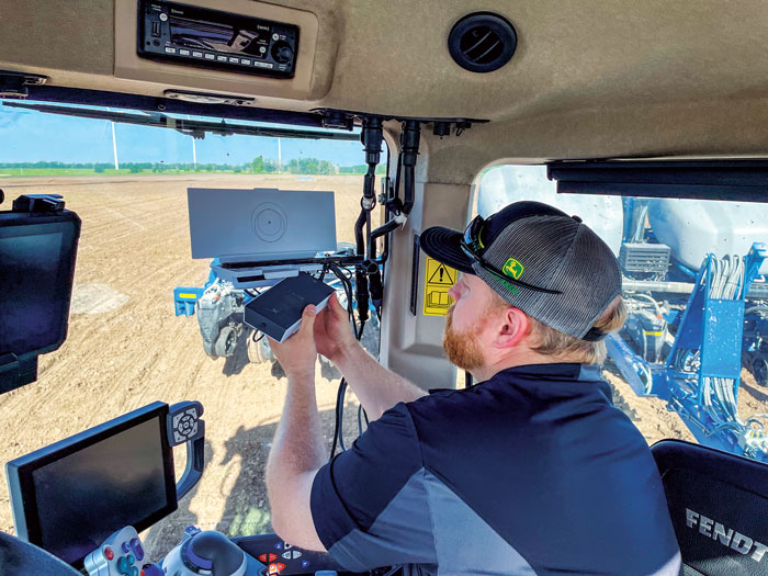 Jonathan Born, regional product support specialist for PrairieLand Partners, inspects a JDLink Boost that was recently installed on a Fendt tractor. Noah Newman