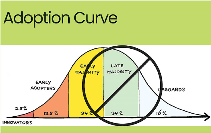 Referencing the adoption curve pictured on p. 58, Boeck identifies a small percentage of farmers who are actually potential targets for cutting-edge technology.