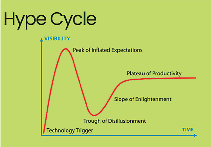 “But behind the scenes, when excitement goes down in the hype cycle, there is actually growth happening,” he adds. “There isn’t a lot of growth when something new comes out because we don’t know what to do with it. At about the time when people are throwing it to the side and saying, ‘Well, this isn’t going to do what we thought,’ that’s when progress is happening behind the scenes and the slope of enlightenment starts to come up.”