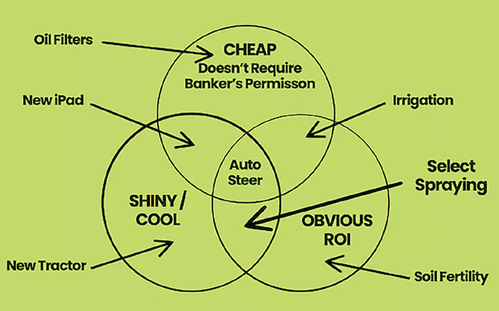 How does Boeck sort through the noise and narrow down which technologies are actually worth the investment? He created a Venn diagram (pictured upper right) to guide his evaluation process, with 3 categories — cheap, shiny/cool and obvious ROI. Autosteer is an example of a technology that fits all 3 categories. If something fits 2 of the 3 categories, like Greeneye, Boeck is confident his team can sell it to customers.