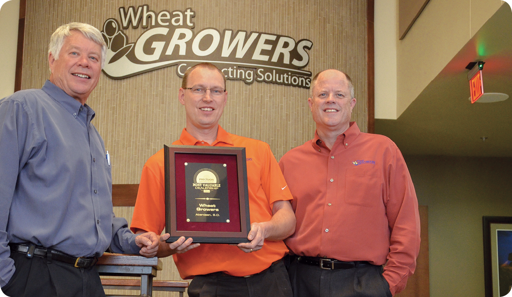 Pictured Above: South Dakota Wheat Growers, a 5,400 farmer member co-op based in Aberdeen, S.D., captures the 2014 Precision Farming Dealer Most Valuable Dealership. From left to right, CEO Dale Locken, Precision Ag Manager Brent Wiesenburger and Sr. Vice President of Agronomy and Corporate Marketing, Stephen Briggs.