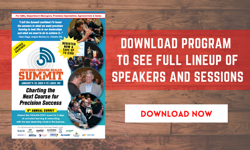 Join top precision farming equipment dealerships from around North America for 2-days of unrivaled learning and networking during the 2026 Precision Farming Dealer Summit. You will discover actionable, best-practice ideas to run a more profitable precision farming business.